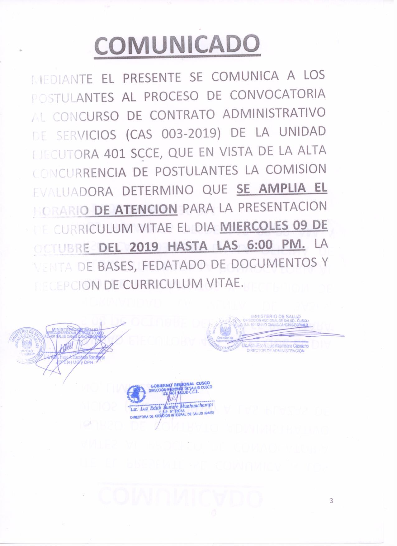 | 005 | CONCLUIDO | SICUANI | CONVOCATORIA PARA LA CONTRATACIÓN ADMINISTRATIVA DE SERVICIOS DE PERSONAL DE SALUD PROFESIONAL Y TÉCNICO. UNIDAD EJECUTORA 409 - HOSPITAL ALFREDO CALLO RODRIGUEZ Bases de la Convocatoria |